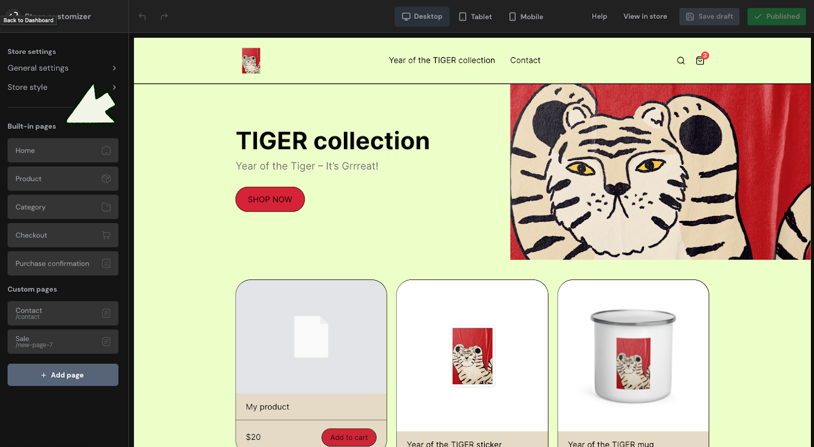 1. In the Store Customizer, select among built-in or custom pages.