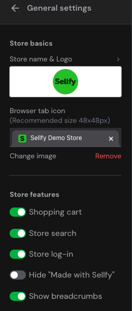 5. Go to the General settings section to change the store logo and adjust basic settings like store login, search, shopping cart, Sellfy branding, and more.