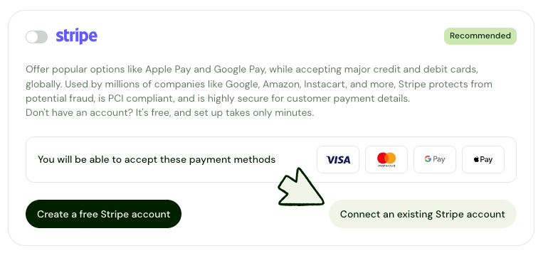 - Stripe allows customers to pay with any major credit card, Apple Pay, or Google Pay.